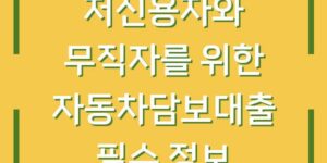 자동차담보대출은 저신용자와 무직자에게도 유용한 대출 옵션으로 여겨집니다. 특히 대출을 받을 때 신용도가 낮거나 직업이 없는 경우, 대출을 받아 어려움을 겪는 분들이 많습니다. 이번 글에서는 저신용자와 무직자를 위한 자동차담보대출의 기본 개념, …
