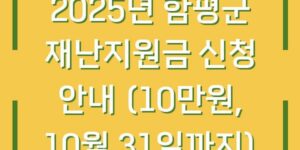 2025년 함평군에서는 군민들을 위한 재난지원금 신청을 진행하고 있습니다. 이번 재난지원금은 10만 원에 해당하며, 신청 기한은 10월 31일까지입니다. 이번 글에서는 지원금의 신청 방법, 지급 대상, 필요 서류 및 유의 사항에 대해 …